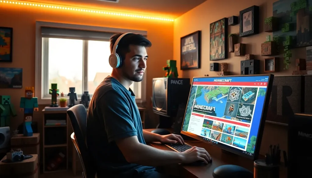 a gamer working at a desk with Minecraft-themed decor and dual monitors.